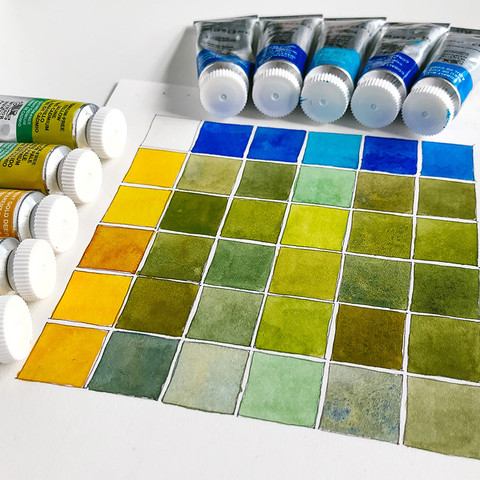 The color chart below shows the yellows and blues I commonly use to make different shades of green. It is a good idea to create a similar chart with the yellows and blues that you have and use it as a reference. Why is it important not to rely on someone else's charts? Even if you use colors with the exact same names, there may be a difference between brands. The pigments can be of different quality, too. The resulting colors may also look different depending on the paper that you use. So I recommend taking your time to experiment with the colors that you have, to play around with them, and not to hurry.